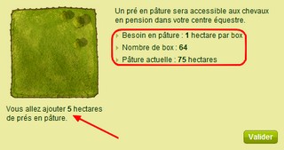 ASTUCE 1 : sur la page de sélection pour valider la mise en pâture de vos prés, vous avez un résumé du nombre de vos box et de la quantitée d'hectare en pâture déjà disponible ainsi que le nombre d'hectare que vous allez ajouter.
